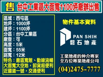 台中工業區大面寬1100坪廠辦出售